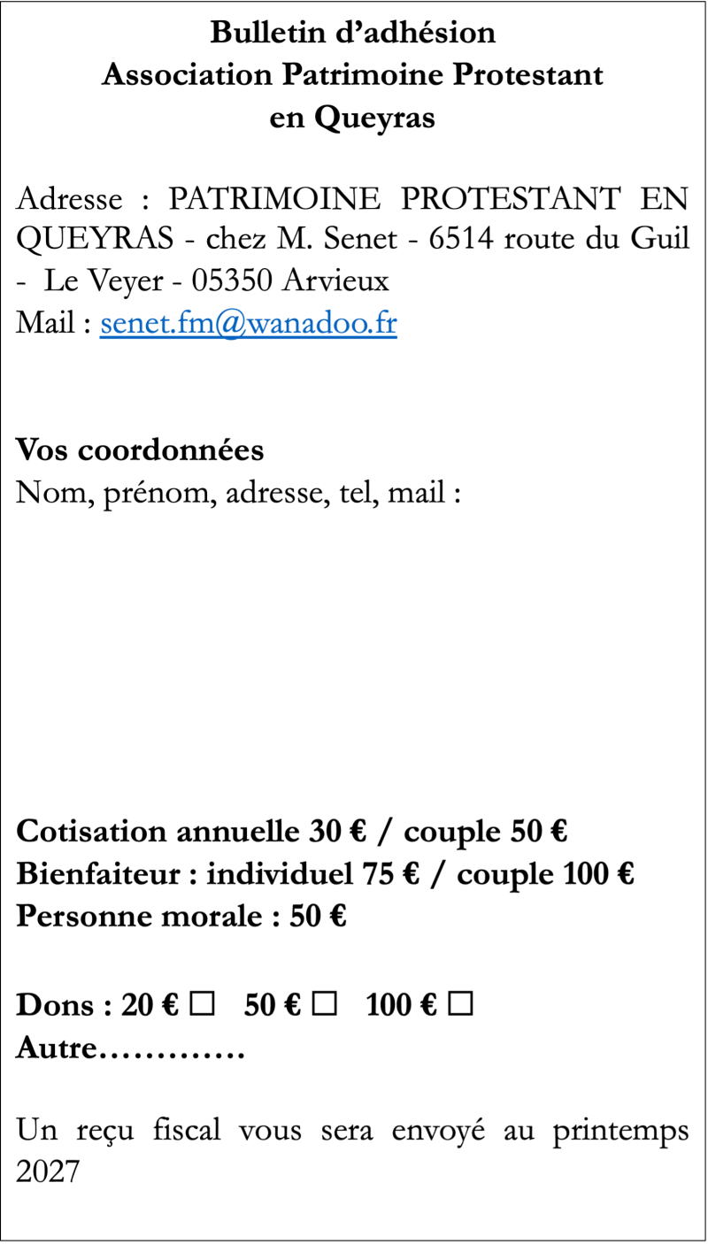 Vos cotisations et dons sont essentiels pour financer la restauration et l'entretien des temples historiques de Fontgillarde et de Pierre-Grosse. Ils nous permettent également d'organiser des expositions, des concerts et des conférences, contribuant ainsi au rayonnement du patrimoine protestant en Queyras.